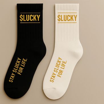 These premium crew socks feature crisp ribbed structure, high-density gold print, and the iconic $LUCKY ticker on the cuff, framed by clean upper and lower lines for that elevated streetwear look.
